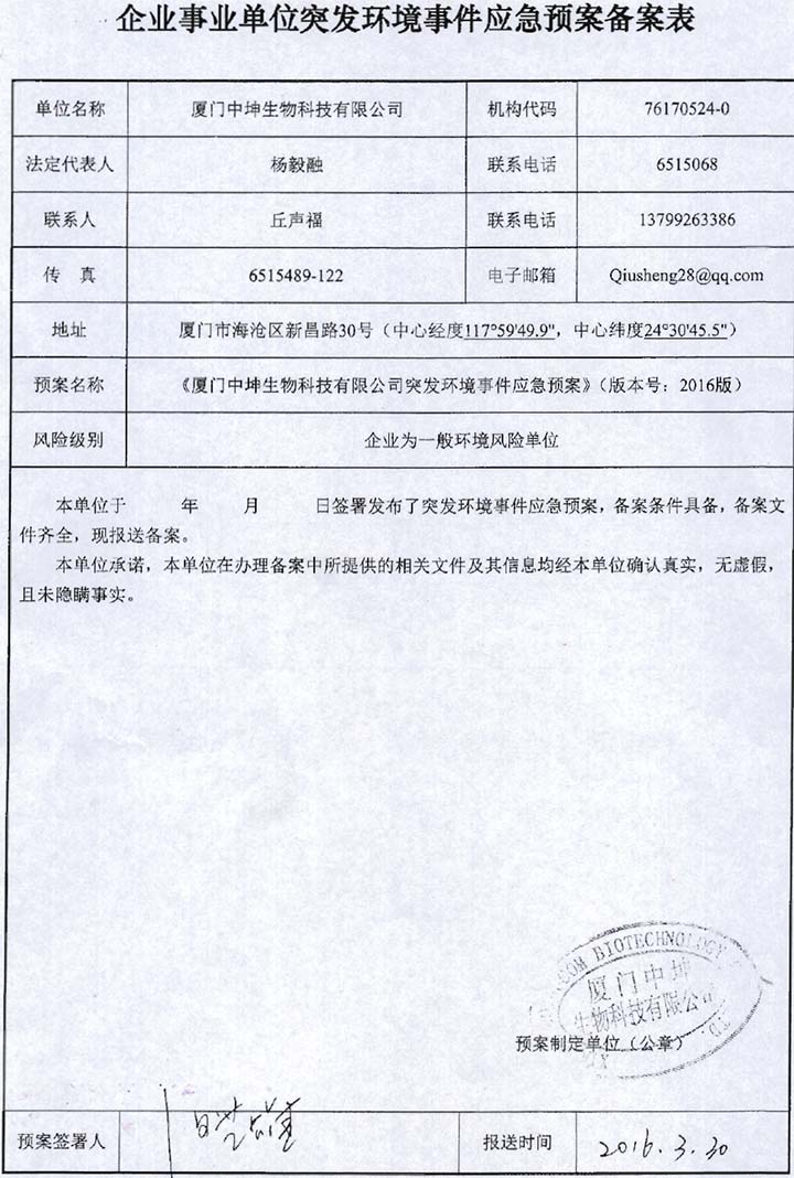 2016年4月1日,中坤生物科技的突发事件应急预案通过修改完成并在厦门市环境保护局海沧分局备案