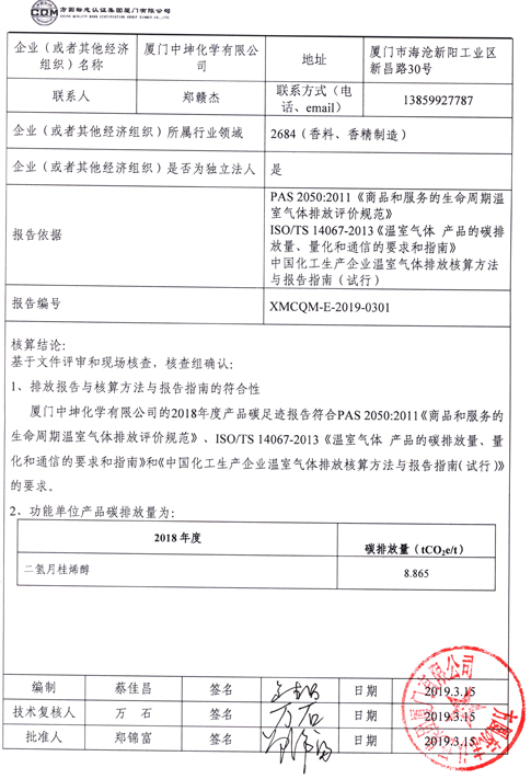 2019年1月,我司委托方圆标志认证集团厦门有限公司对我司2018年二氢月桂烯醇产品碳足迹进行核算,核算结果为:厦门中坤化学有限公司2018年二氢月桂烯醇吨产品的碳排放量为8.865tCO2e。