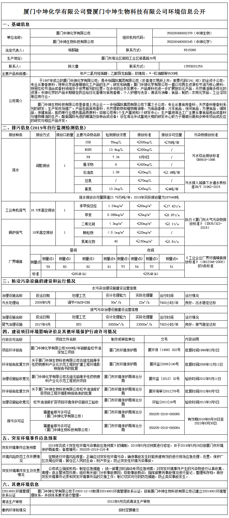 厦门中坤化学有限公司暨厦门中坤生物科技有限公司环境信息公示